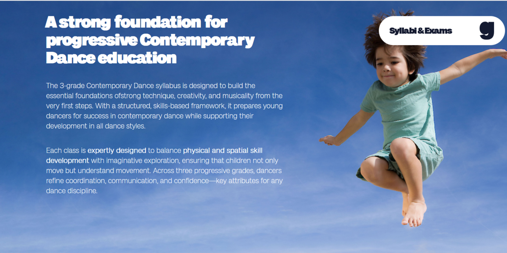 The 3-grade Contemporary Dance syllabus (Creative Movers, Pre-Primary, Primary) is designed to build the essential foundations of strong technique, creativity, and musicality from the very first stages of learning. With a structured, skills-based framework, it prepares young dancers for success in contemporary dance while supporting their development in all dance styles.